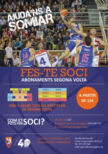 Sota el lema “Ajuda’ns a somiar”, el Club Bàsquet Tarragona engega la campanya per fer-se soci de l’entitat per la segona volta del campionat, que començarà el dissabte 19 de gener davant el CB Cornellà al Pavelló del Serrallo.