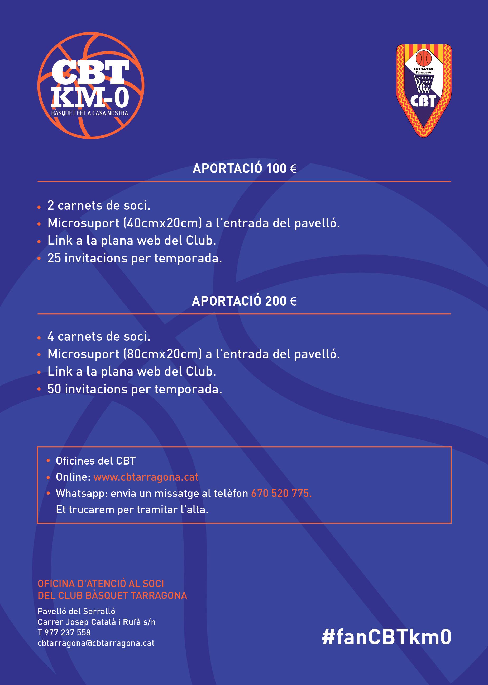 Una vegada confirmada la presència del Club Bàsquet Tarragona en LEB Plata la temporada que ve, arriba l’hora de buscar nous patrocinadors que permetin al club trobar l’estabilitat econòmica. En aquesta línia, la directiva del CBT porta temps treballant en un projecte que avui veu la llum, una campanya de micropatrocinadors. La idea és que qualsevol petit negoci de la ciutat col·labori amb el club amb una quantitat de 100 o 200 euros. Per la seva banda, a cada negoci que aboni 100 euros, el club li donarà 2 carnets de socis, 25 entrades per repartir durant tota la temporada i un petit cartell publicitari de 40cm x 20cm en l’entrada del pavelló, si es prefereix col·laborar amb 200 euros es donen 4 carnets de socis, 50 entrades per repartir i el cartell tindrà una dimensions de 80cm x 20cm. A més, en tots dos casos s’afegeix un enllaç del patrocinador a la pàgina web del club.